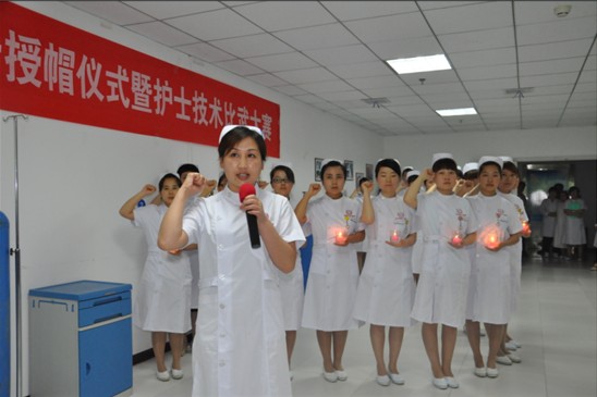 【图1:护士们手捧蜡烛面对南丁格尔画像庄严宣誓】
