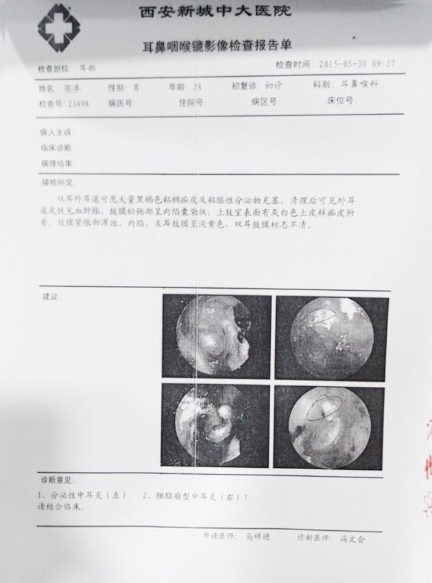 2015年6月4日中大医生张全安教授通过耳内镜、纯音测听、耳导抗为樊先生检查后结果显示:他的左耳为分泌性中耳炎,右耳为胆脂瘤型中耳炎;左耳气导听阈50dB,左耳骨导听阈16dB,右耳气导听阈38dB,右耳骨导听阈23dB;左耳均呈C型曲线,右耳均呈B型曲线。检查结果表明:樊先生左耳为中度听力损失,右耳为轻度听力损失。