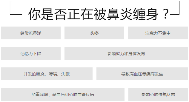 鼻炎所引起的头晕头疼、精神萎靡、记忆力下降以及鼻涕连连形象受损外,还给生活和工作带来很大影响;长期炎症还会导致咽炎、失眠、哮喘、鼻息肉和鼻甲肥大的发病率升高;另外长期鼻塞缺氧更会导致脑梗塞、高血压和心脏病突发,尤其是易患高血压的中年人应该引起足够重视。中年人患鼻炎如何治疗?【点击这里】直接在线咨询,为您解答