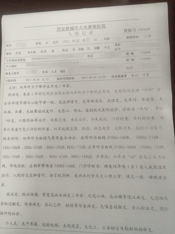 9月1日中午,西安新城中大耳鼻喉医院来了位老人,面色苍白,手频繁的摸左耳朵。这位老人姓何,来自西安市长安区,何奶奶称自从与自己相依为命的老伴去世后,以前性格开朗、待人和蔼的她不知为何变得越来越寡言少语,有时为一件小事也会忍不住发脾气,一年多来总是受耳鸣折磨。