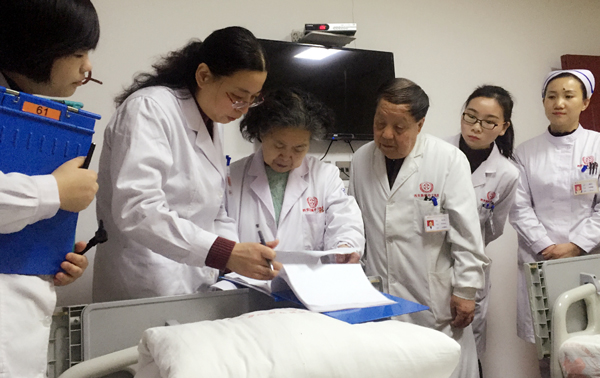 冷同嘉教授查房过程中仔细聆听管床医生对病人病史的汇报,现场详细检查询问,并对住院患者给予了指导。